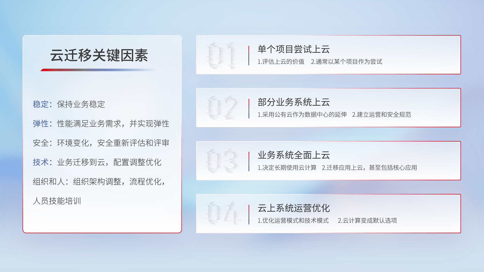 结合实际业务,,从规划设计、、云平台选型、、、云原生改造、、数据迁移、、集成交付,,,迁移全过程为客户识别最佳上云路径,,,,做好风险识别管理,,,,设计网络架构、、、、身份权限、、、安全审计合规、、、、操作审计、、、日志审计、、监控告警策略、、、多站点容灾设计等,,,对云上基础设施进行整体规划,,,,提升IT治理水平,,,以满足弹性、、、、高可用、、高性能的需求。。。。