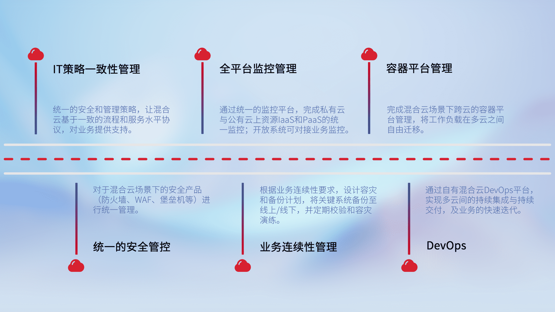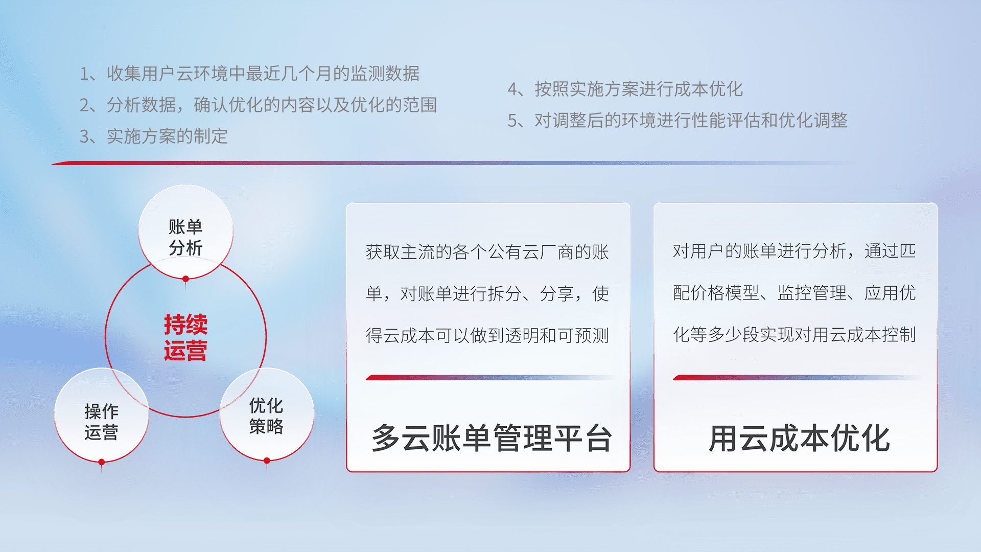 通过多云纳管,,,以统一的资源数据模型把客户的云资源进行抽象和封装,,,,进而实现对多云资源的统一操作,,,,保障云资源管理的可靠性、、、、稳定性与可用性。。。。量身定制化运维内容,,,,配置、、、开发运维、、补丁管理、、、、备份、、、、监控、、认证和访问管理、、、、审计和日常巡检等,,,,保障在用云过程中的可靠度,,,,稳定度以及高可用率。。。