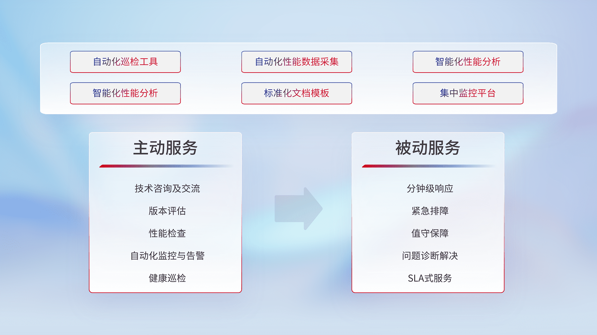 智能化工具和标准化文档,,保障服务质量,,,提供主动服务(包含技术咨询、、、版本评估、、、、性能检查、、、、自动化监控与告警、、健康巡检)和被动服务包含(分钟级响应、、紧急排障、、值守保障、、、问题诊断解决、、、、SLA服务)。。