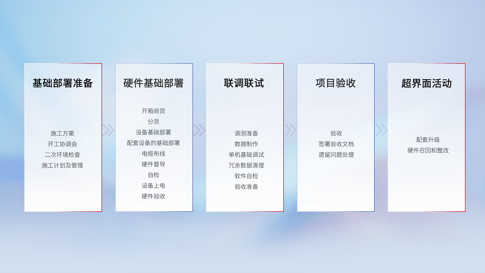 从基础部署准备、、、硬件基础部署、、联调联试、、、项目验收、、越界面活动的全过程可追溯,,,,保证施工质量和进度。。。。